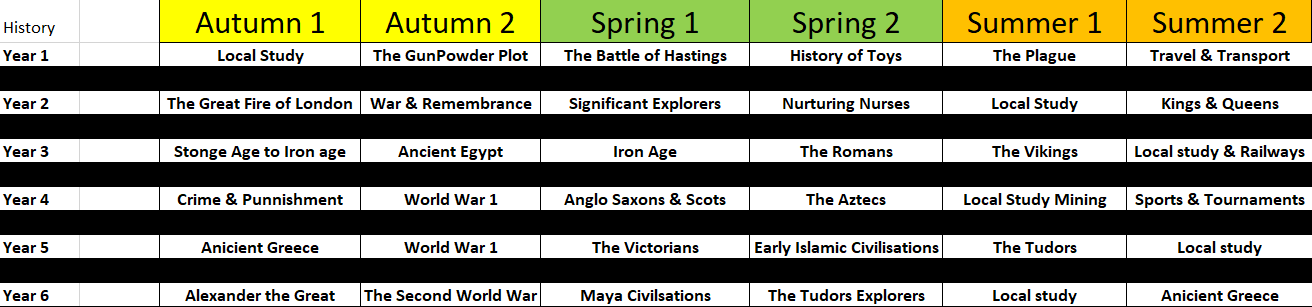 We strive to support your child to learn about their locality, Britain’s past and the wider world, and understand how they interlink with each other. We feel that it is important that History is taught discreetly and that we bring History to life in a variety of exciting ways.