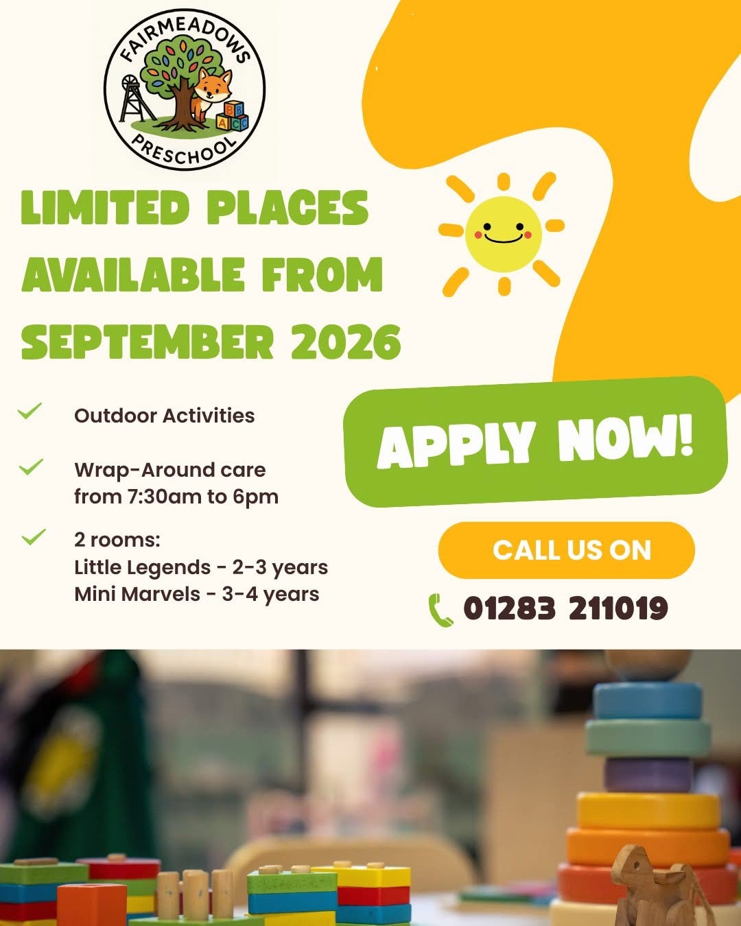 To apply for a place in our Pre-school, please contact Fairmeadow's Foundation Primary School on info@fairmeadows.derbyshire.sch.uk or at 01283 211019. You can also ask at the reception desk for an application form.